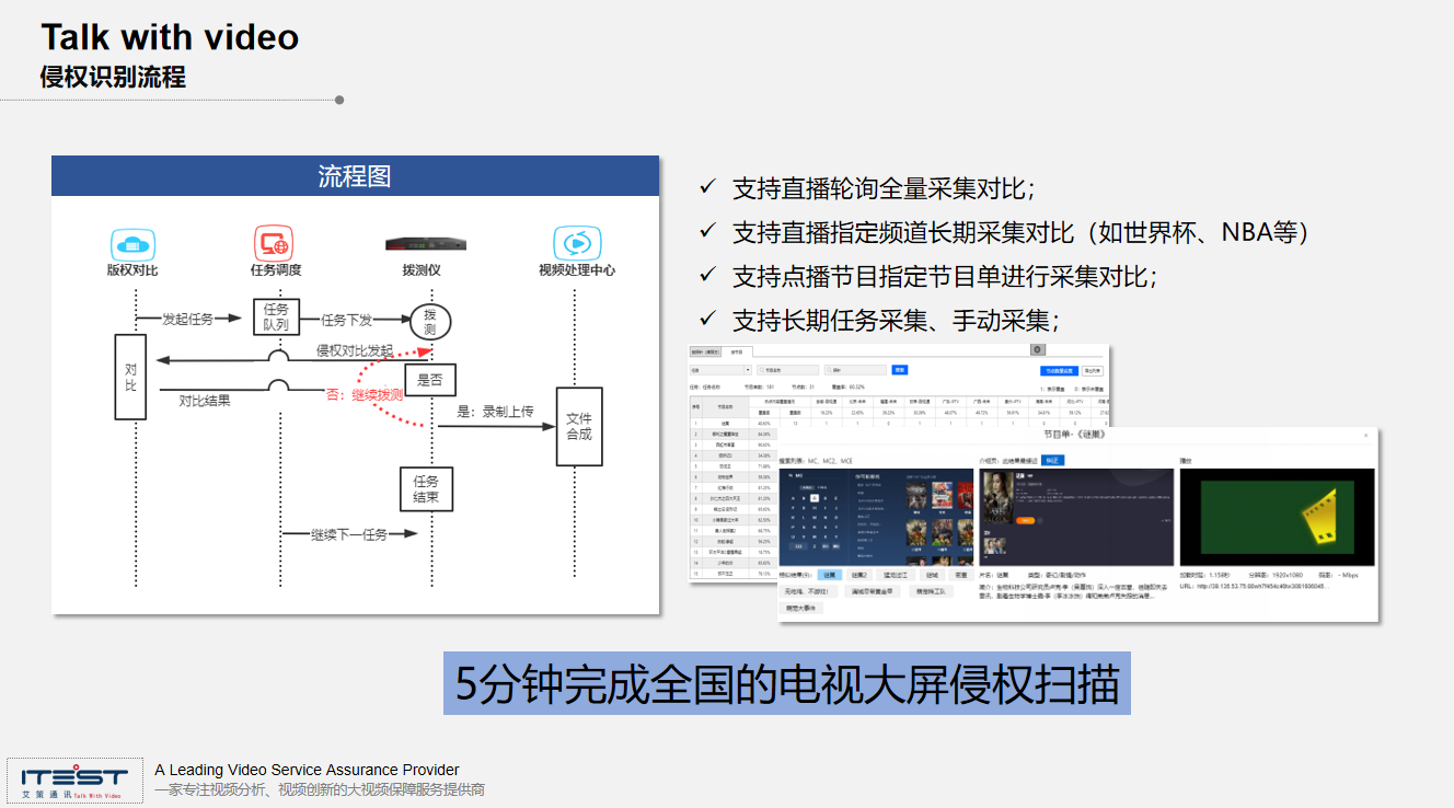 不管是我們自己創作的內容,或者說是購買的內容,如果想要發現別人有沒有侵我的權,或者想發現我自己是否存在侵權行為,都可以通過這種智能化的侵權識別技術去完成。只需要發出一個指令,就可以觸發全國各地的監測點進行自動掃描,如果發現侵權,我們就會錄取證據,證據錄取之后就會上傳到云端。目前這種侵權掃描的技術有多種應用模式,其中有一種應用模式,可以實現在5分鐘之內對全國31個省所有電視大屏進行掃描,并提供掃描結果。