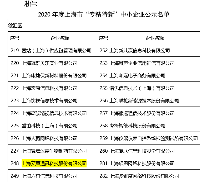 近日,2020年度上海市“專精特新”企業名單公示,上海市徐匯區65家企業入選該名單,其中包括上海艾策通訊科技股份有限公司。