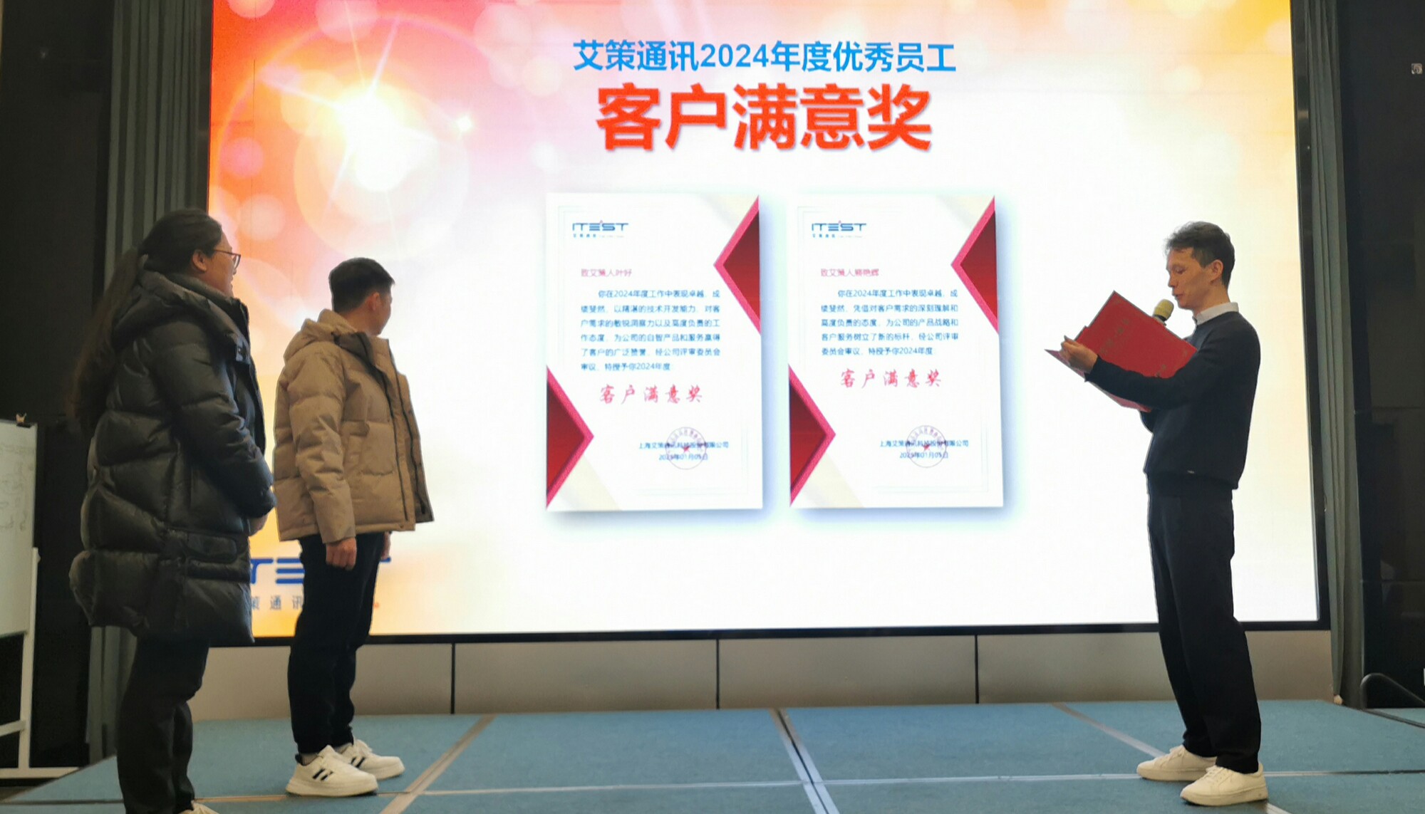 總經理劉總代表管理團隊向全體員工進行工作報告。他回顧了2024年所取得的成就,并通報了2025的希望與挑戰。每一項數據背后的故事,每一個里程碑的意義,在這一刻都變得無比生動和具體。劉總在講話中充滿了對團隊的肯定與期待,他說:通過這幾天會議討論研究,公司推出多項切實可行的解決方案,期待這些舉措能在新的一年里開花結果,牢塑客戶價值體系,提升艾策通訊的競爭力。