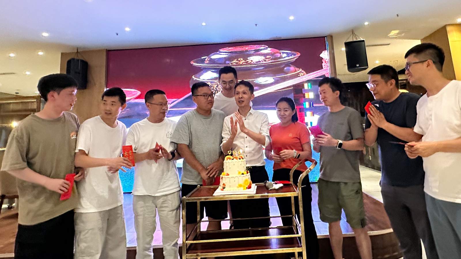 聚餐過半,氣氛愈發濃厚。活動特別為七月過生日的同事們準備了驚喜 —— 一場簡單卻滿含心意的生日慶祝。王總為壽星們送上生日紅包,眾人圍坐在一起,共嘗生日蛋糕。